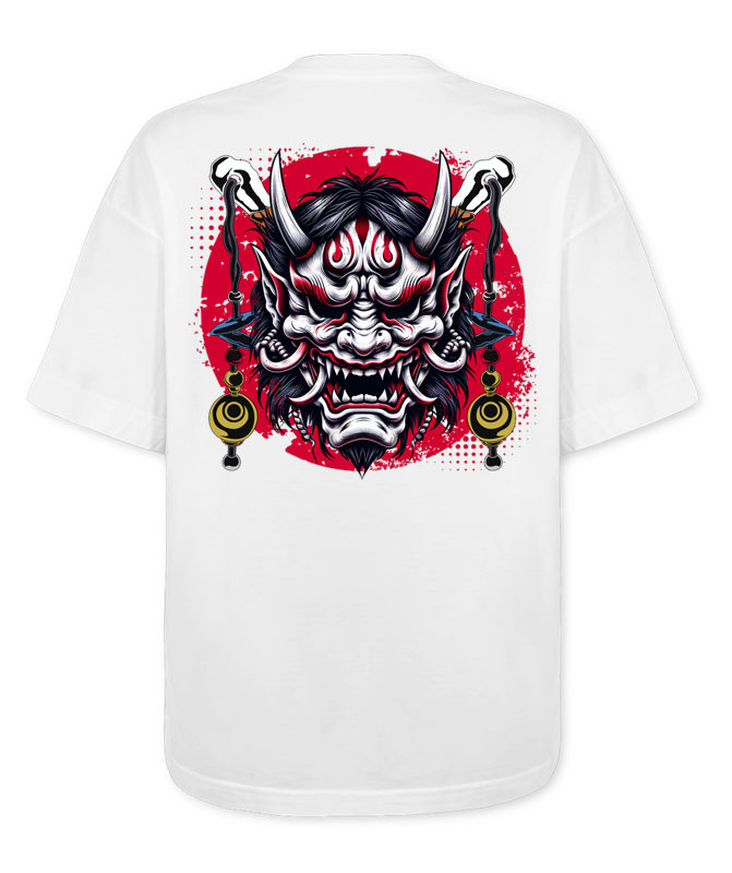 Camiseta Super Oversized - [Streetwear, Japonesa, Oni, Hannya, Máscara, Samurai, Haradachi, Raiva, Espírito, Demônio, Cultura Japonesa, Arte Oriental, Moderna, Tradicional, Folclore, Urbano, Vermelho, Dourado, Intenso, Masculino, Estampa]