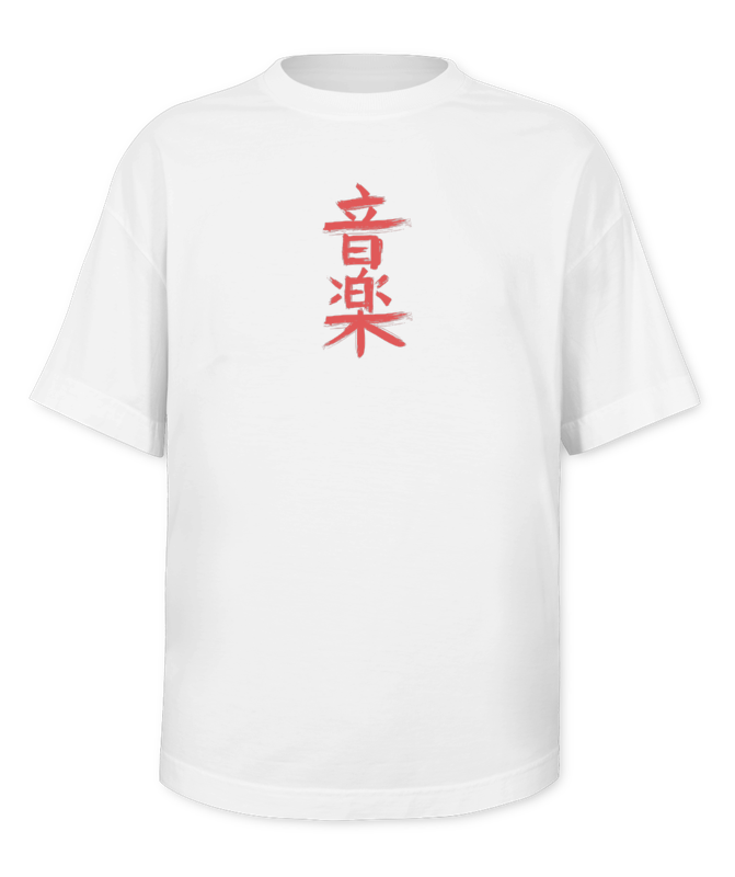 A estampa apresenta caracteres japoneses em estilo de pincelada caligráfica, sobre um círculo vermelho que remete ao sol nascente. O design é minimalista e expressivo, com respingos de tinta que adicionam movimento e energia à composição. As linhas fluidas e a simplicidade das formas criam um efeito visual elegante, transmitindo sofisticação e dinamismo ao mesmo tempo. A frase em japonês 「音楽」 significa “Música”. Ela conecta a arte à expressão cultural e artística, destacando a harmonia e o ritmo presentes tanto na caligrafia quanto no conceito da música. A combinação do caractere com o círculo vermelho reforça a energia e a presença da mensagem na estampa. Na cultura japonesa, a caligrafia é considerada uma forma de arte que combina técnica, estética e emoção. O círculo vermelho simboliza o sol nascente, tradição do Japão, representando energia, vitalidade e renovação. A estampa transmite não apenas a palavra “música”, mas também o equilíbrio entre arte, cultura e expressão pessoal, tornando-se um símbolo de criatividade e inspiração.