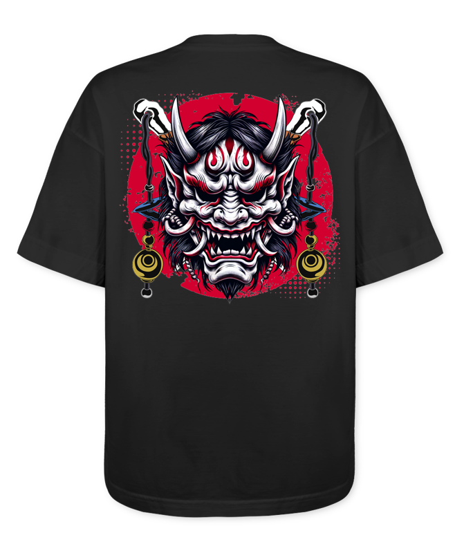 Camiseta Super Oversized - [Streetwear, Japonesa, Oni, Hannya, Máscara, Samurai, Haradachi, Raiva, Espírito, Demônio, Cultura Japonesa, Arte Oriental, Moderna, Tradicional, Folclore, Urbano, Vermelho, Dourado, Intenso, Masculino, Estampa]