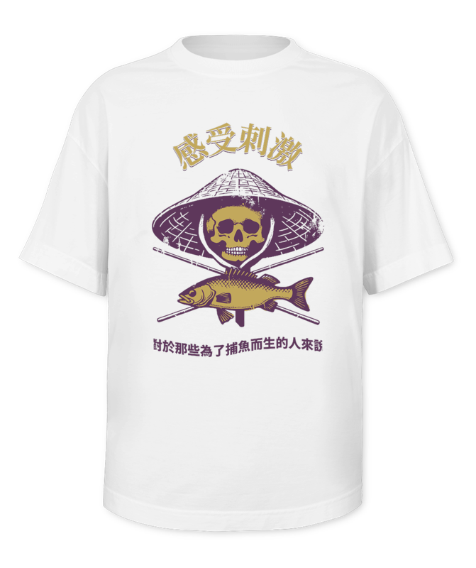 Camiseta Super Oversized - [Estampa Crânio, Chapéu Cônico, Peixe Atravessado, Remos Cruzados, Cores Roxas, Tons Dourados, Design Estilizado, Arte Simbólica, Cultura Oriental, Tradição Japonesa, Desafio E Coragem, Vida E Morte.]